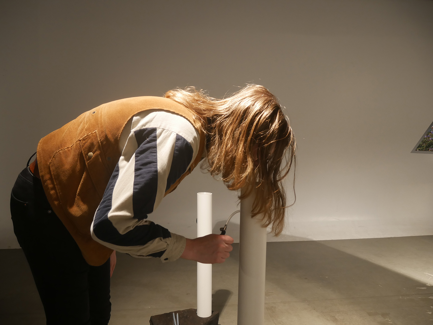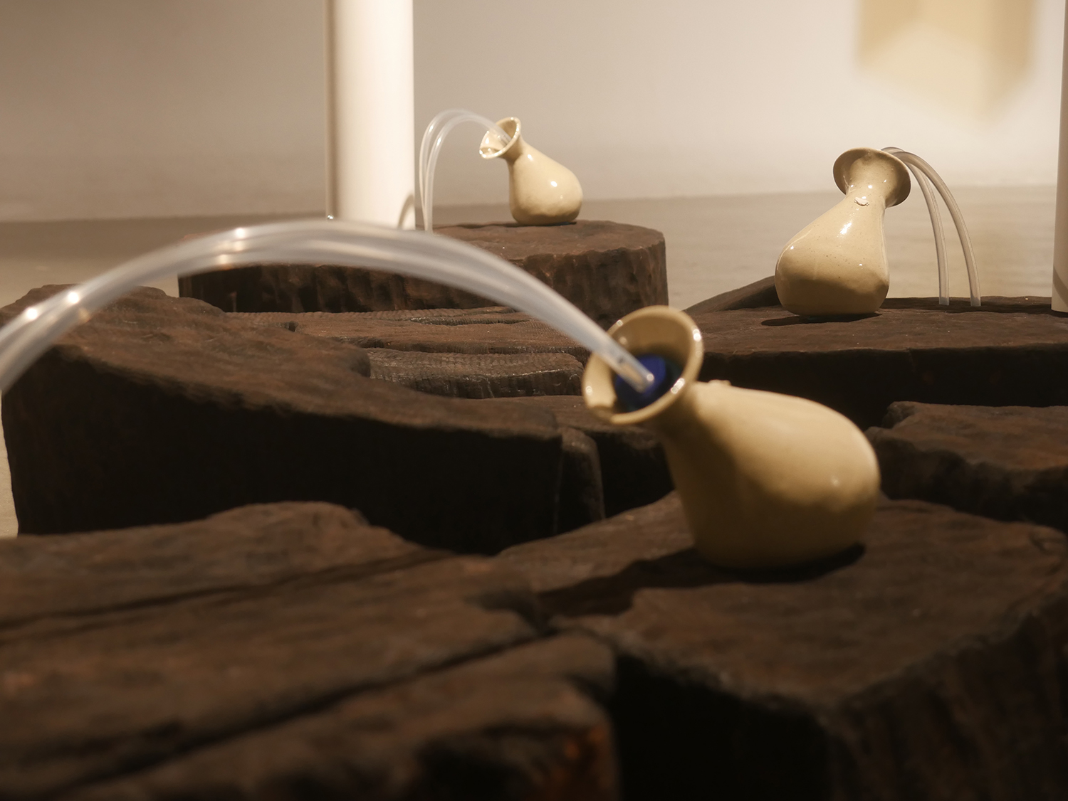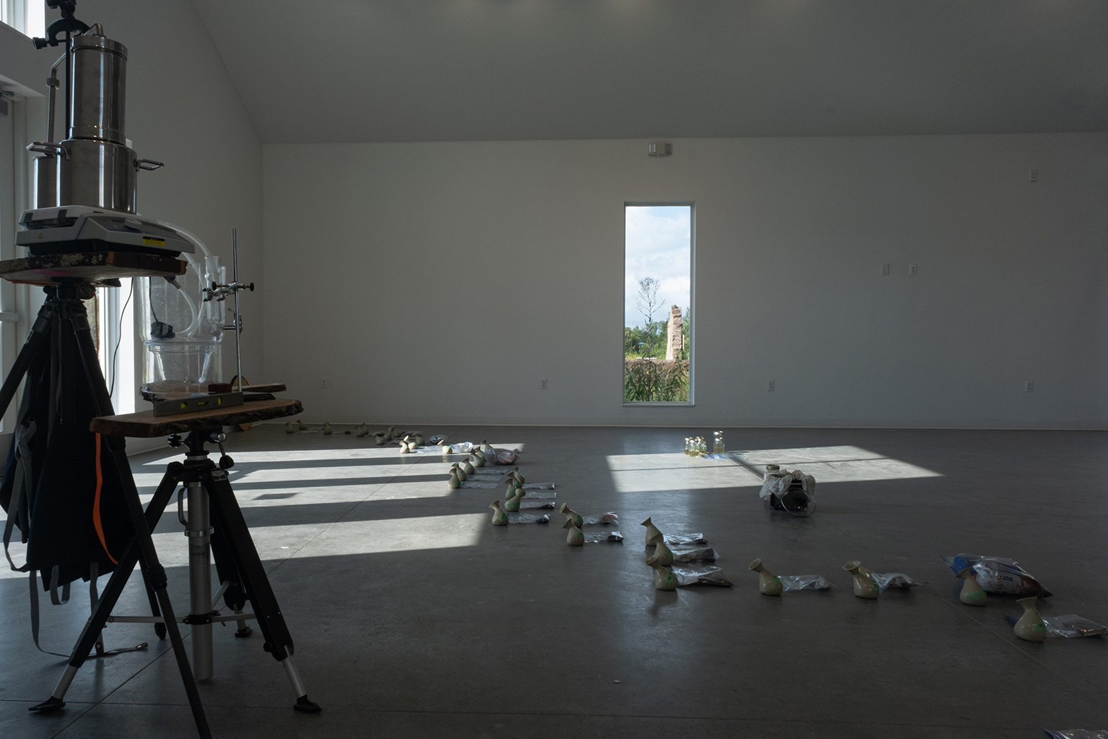 The sculptural elements of the installation referenced visual and material aesthetics from along the pipeline, including pipeline posts, polyethylene tubing, rubber bulb pumps and plastic funnels on a fractured and charred pin oak base, and painted wood structure mimicking aerial pipeline markers holding didactics and inkjet printed photographs of the three selected sites.