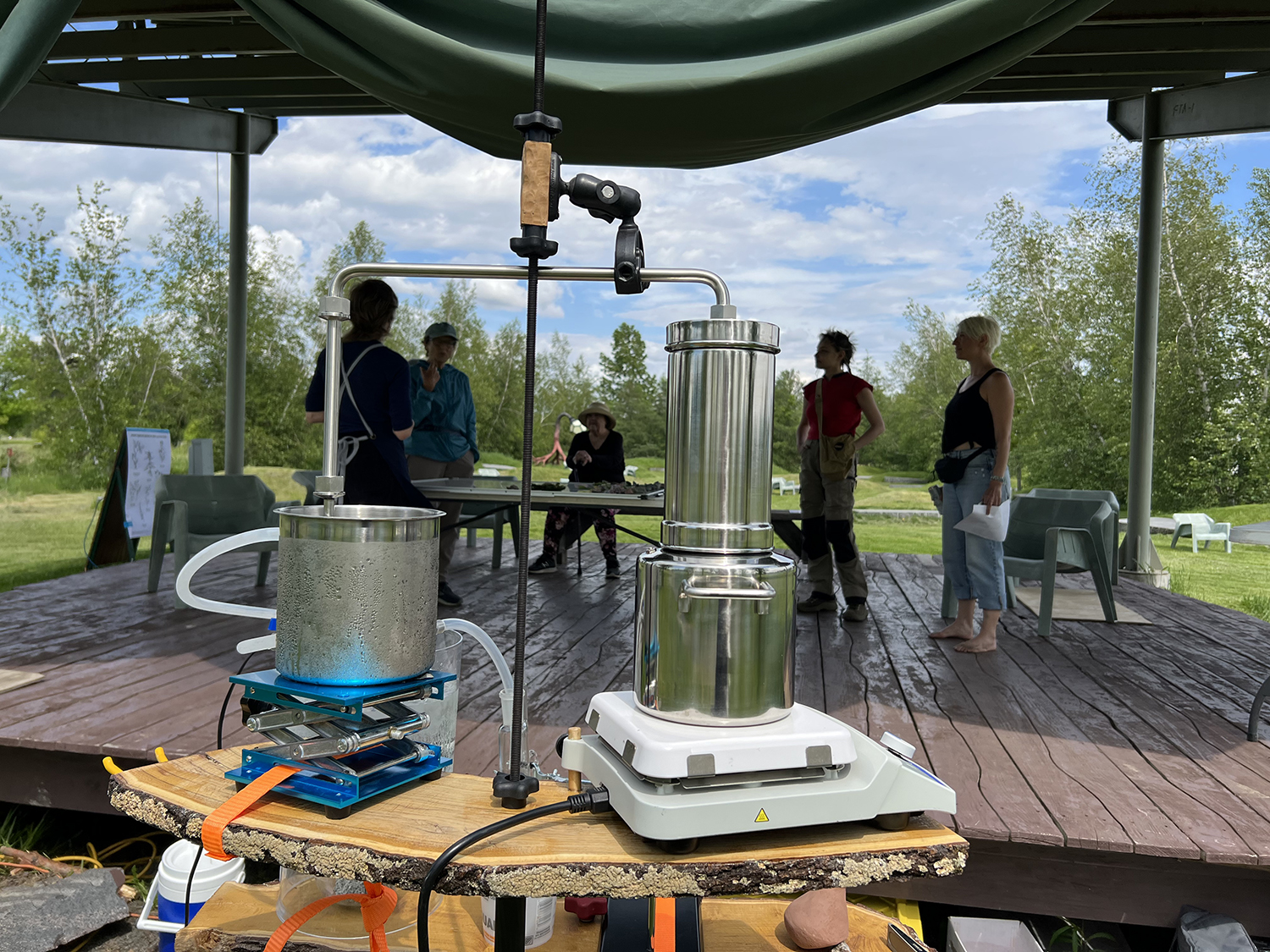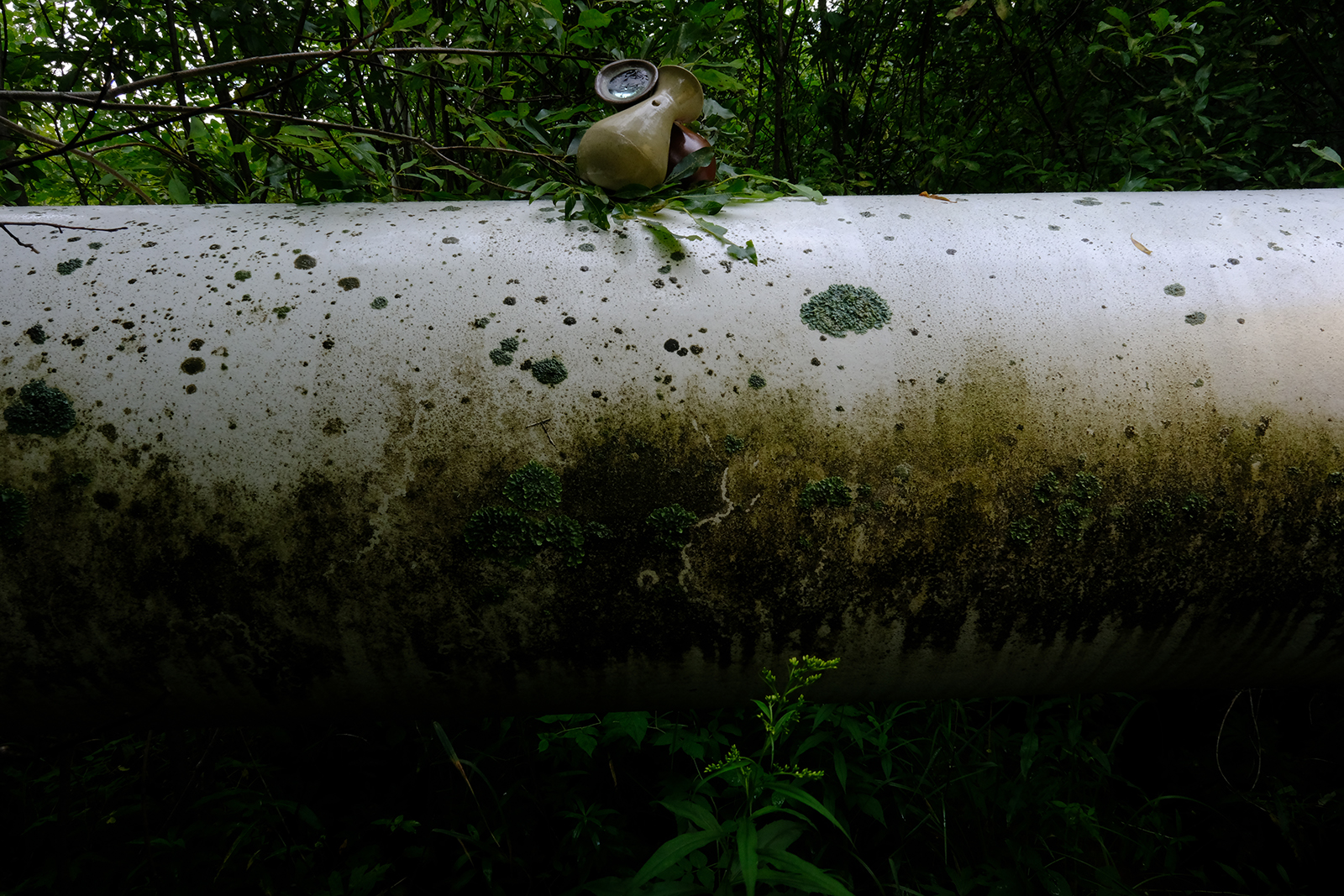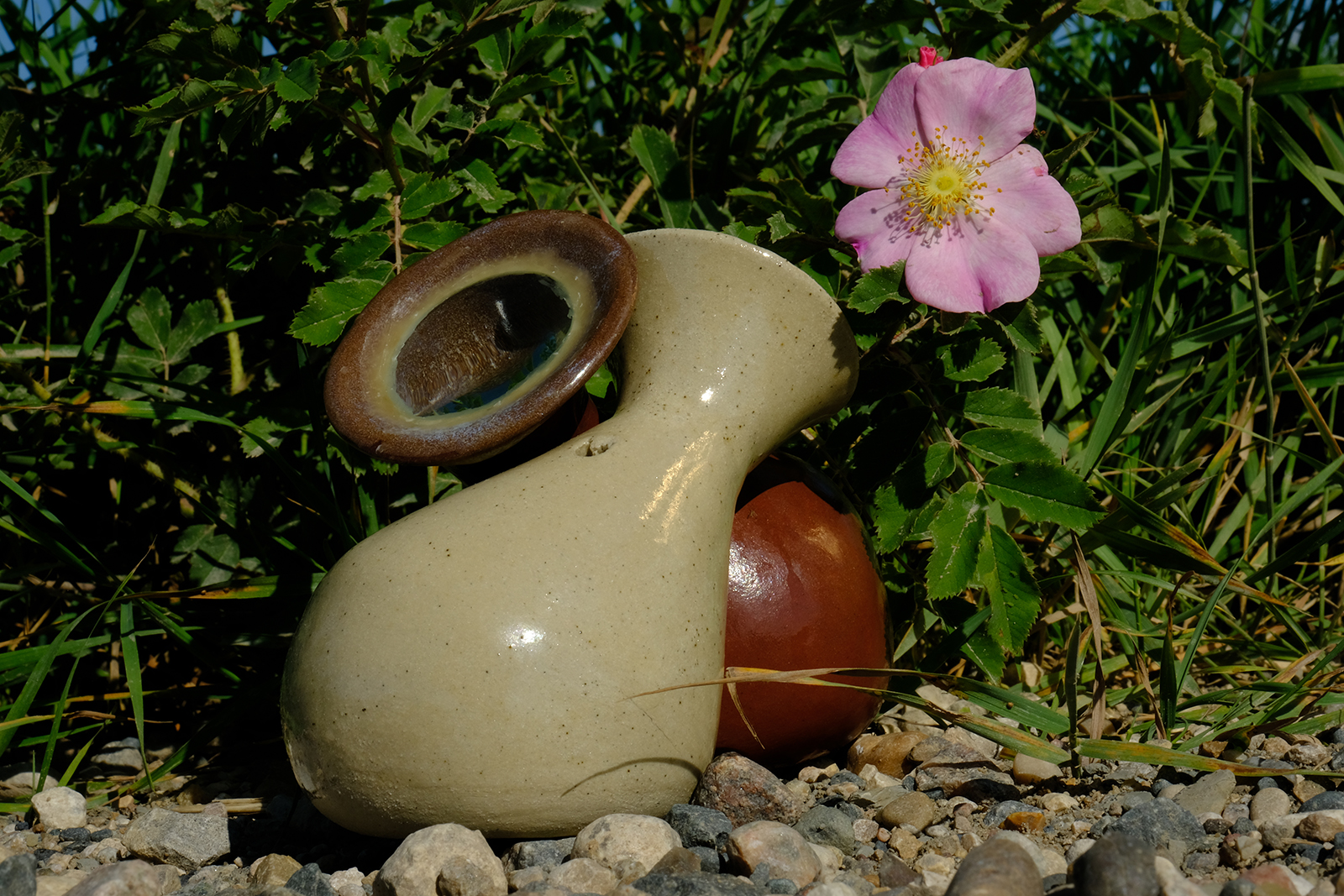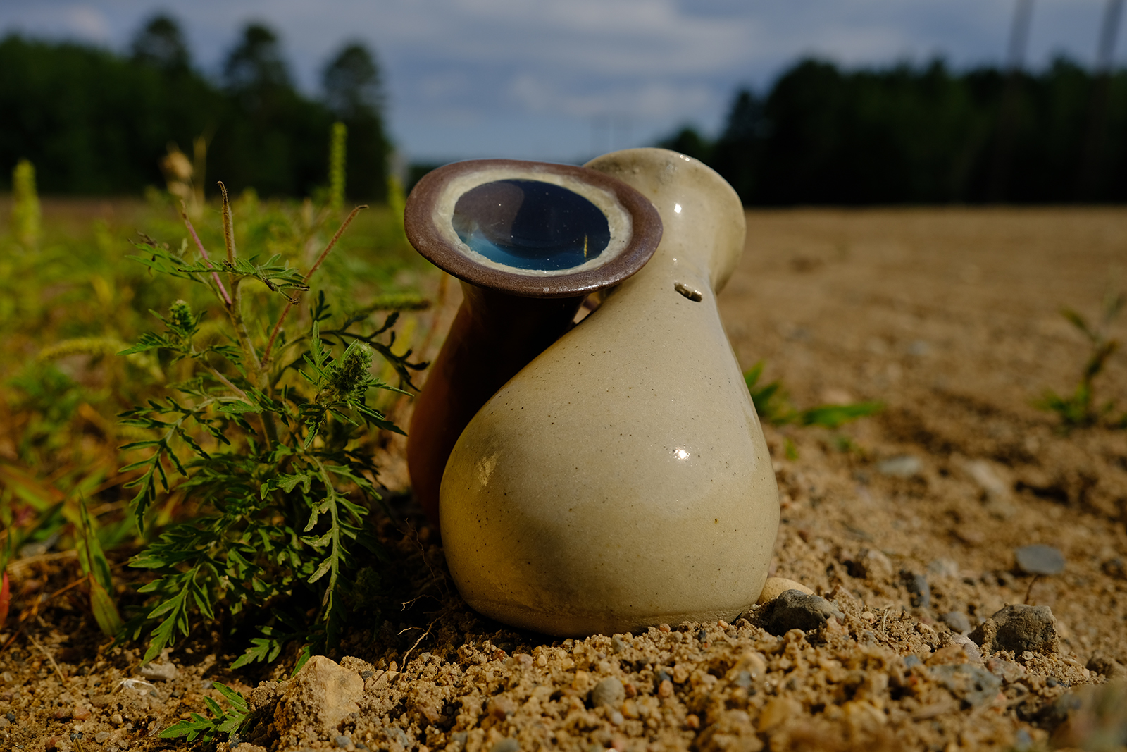 This installation, created in Spring 2023, includes three of 36 scents we are creating in response to our experience traveling the 1000-plus miles of the contested Line 3 crude oil pipeline, from Edmonton, Alberta across the US/Canada border to Superior, Wisconsin. Along the pipeline, we stopped at 36 sites and did the following three things. First, we deposited a “scent poem” for the plants living atop the upturned earth; each scent poem (created prior in public workshops we hosted) consisted of oils infused with scent-signaling compounds used by plants, in a handmade ceramic vessel fitted with a lens to heat the oils in the sun. Then, we photographed each site, along with two ceramic vessels: a red earth vessel we left there with the poems, and a corresponding buff stoneware one that we labeled and took home. Finally, we gathered roadside debris and made notes about each site: nearby plants, smells, sounds, insects, details from conversations with other people, the importance of each site, etc.